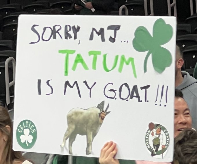 赛前,绿军主场球迷举牌,上面贴着塔图姆头像的山羊和绿军队徽,配文写道:“对不起了MJ(乔丹),塔图姆才是我心目中的GOAT(山羊,历史最佳之意)。”