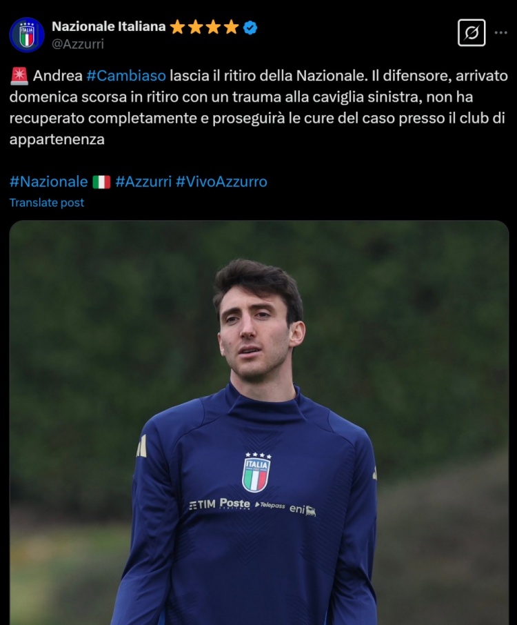 意大利队官方:坎比亚索因左脚踝伤势退出本期国家队,将返回尤文