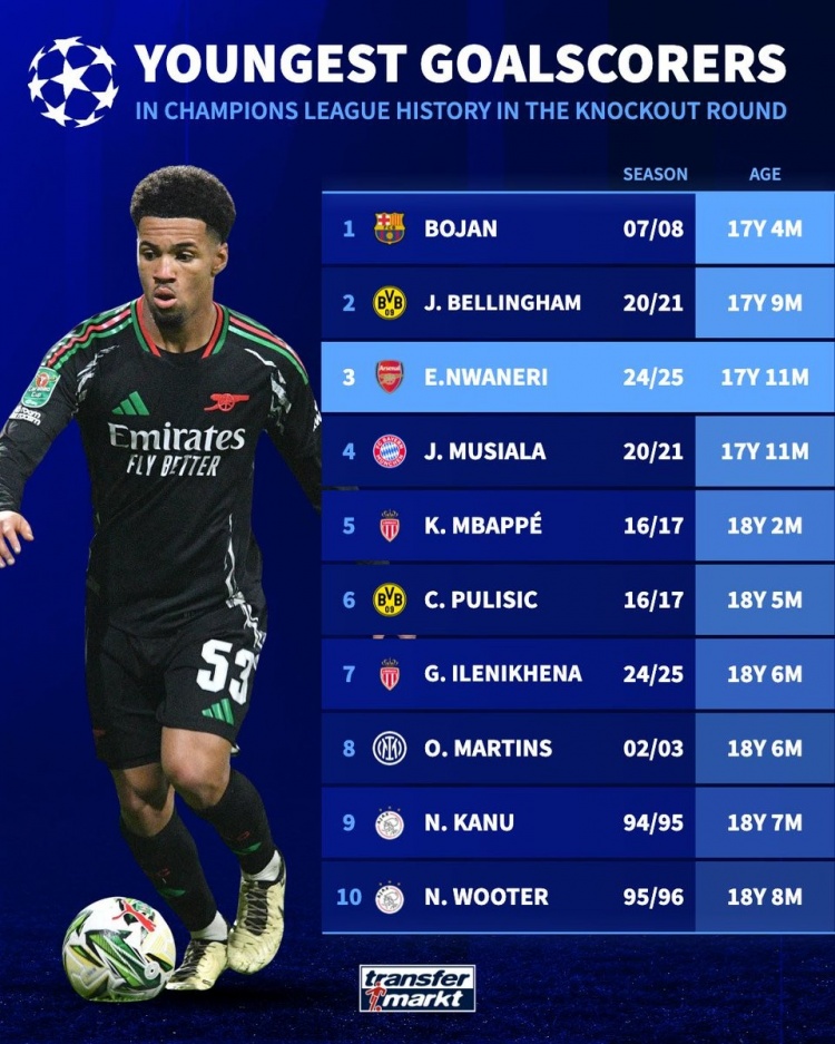 3月5日讯 阿森纳在本轮欧冠淘汰赛客场7-1血洗埃因霍温,小将恩瓦内里破门,数据统计显示他也是历史第3年轻达成欧冠淘汰赛进球的球员。